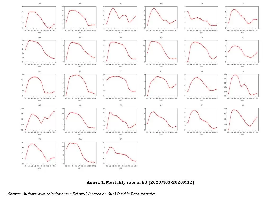 On the other hand, the mortality rate calculated as a percentage of the total number of deaths in the total number of cases (Annex 1) demonstrates that, in 2020, the period April-June was the most difficult one, with several Member States accounting a COVID-19 mortality rate higher than 11%. In this regard, we may look to the epidemiological developments in Belgium, which also registered the highest mortality rate among EU Member States (16.2% – May 2021), followed by Italy (14.4% – June 2021), Hungary (14.1% – June 2021) and Spain (11.5% – April 2021). Starting with March, Member States began to impose severe restrictions, and the effects on the new COVID-19 cases / deaths became visible after May-June, when the mortality rate entered on a downward path. The cause of this reduction was mainly determined by the decrease in the number of new COVID-19 cases, respectively by the reduction of the hospital overwhelming, which also generated a marginal increase in the capacity of medical staff to save patients with severe forms of COVID-19.