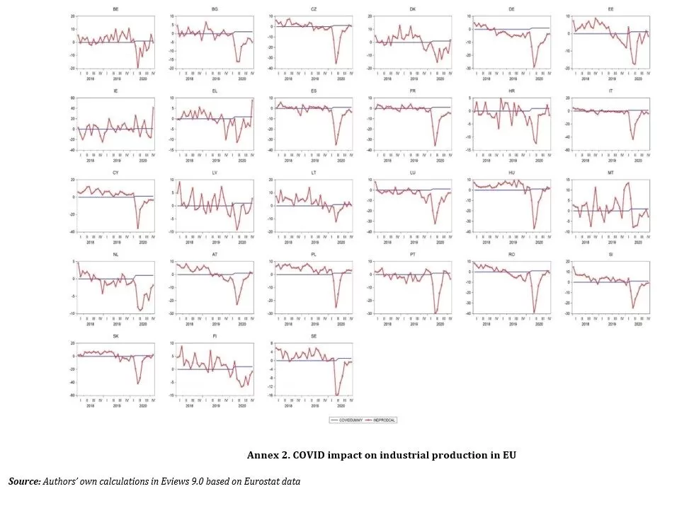 The industrial production sector is one of the most important sectors in the economy. At the same time, the industrial sector may be severely affected by internal and external shocks resulting from fluctuations in the business cycle (Behun et al., 2018). Thus, the decline in economic activity caused by lockdown has generated substantial decreases in global industrial production. Furthermore, at European Union level, some industrial companies experienced a dramatic fall as a result of measures imposed by the authorities to limit the spread of COVID-19.