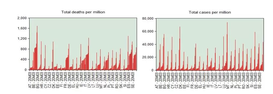 Following the examination of the number of deaths per million inhabitants, it can be seen that the most affected Member States in the EU, at the end of 2020, were Belgium (1685 deaths per 1 million inhabitants), Slovenia (1297 deaths per 1 million inhabitants) and Italy (1277 deaths per 1 million inhabitants), which are also ranked in the top seven countries globally from the point of view of this indicator, according to the data provided by Worldometers. This confirms the challenges that these countries have faced, especially those that have resulted from hospitals overwhelming.