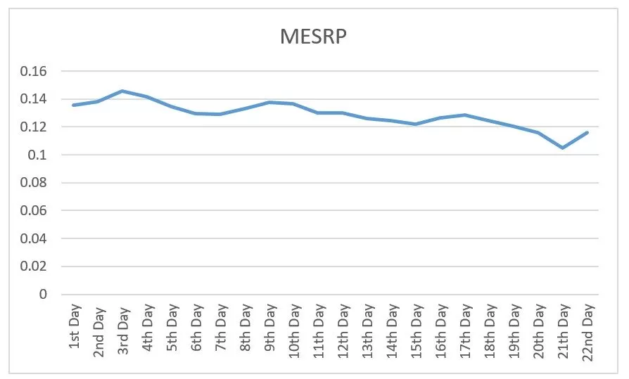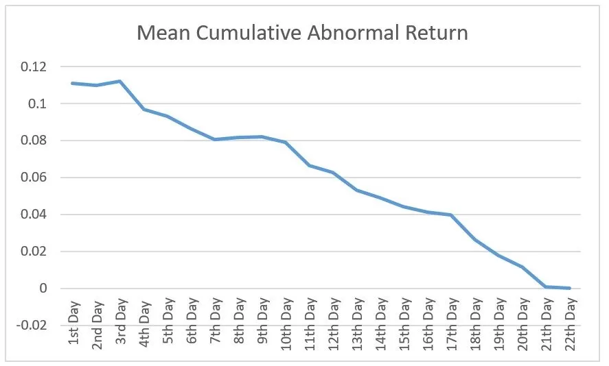 From the above graph, we can observe that the mean cumulative abnormal returns are highest on the first trading day. The cumulative abnormal returns have been subsequently falling. At the end of the month, the cumulative abnormal returns are approximately equal to zero.