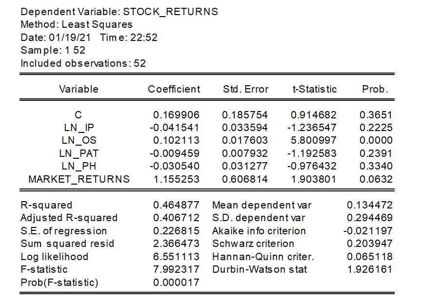 For 1 unit increase in the over subscription causes 0.102-unit increase in the IPO returns. Looking at the Adjusted R squared value i.e. 0.406712, we can say that around 40.67% variations can be explained from all independent variables.