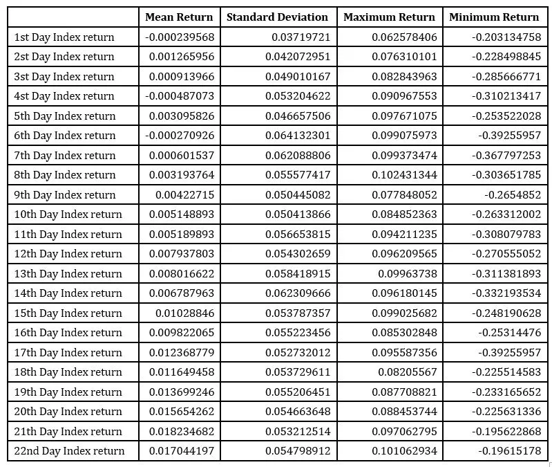 It is observed that the highest returns are observed on the 3rd trading day. The average returns were 14.52%, ranging from -19.22% to 117.55% with standard deviation of 18.57%. For the similar 3rd trading day, Index return on average is 0.09% and it ranges from -28.56% to 8.26% with standard deviation of 4.90%