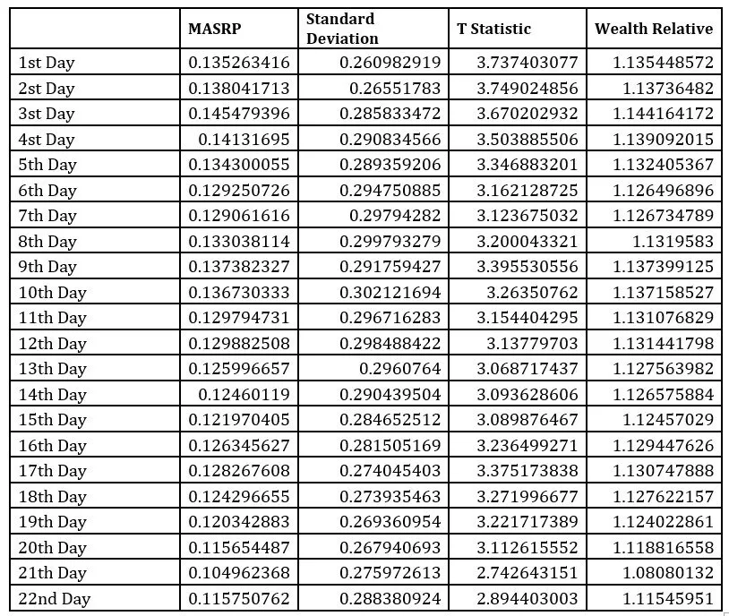 The above table shows the market adjusted initial returns, standard deviation and wealth relative index along with t-statistic. The market adjusted short run performance for the 1st, 5th and 22nd day are 13.52%, 13.43% and 11.58% respectively which simply means that the abnormal returns are slightly falling near the end of the month. The similar result is being shown by the wealth relative index which is 1.14, 1.13 and 1.11 for respective days. The critical value of T at 95% confidence level is 2.009. It is observed that the calculated values for all the days are greater that the critical value. Hence, we can conclude that the returns are significant.