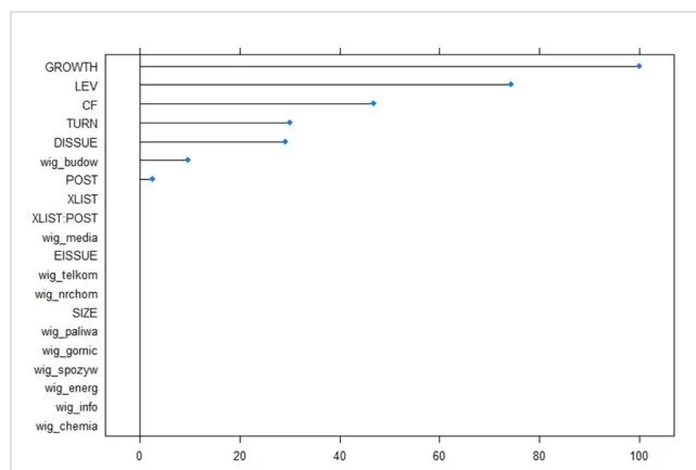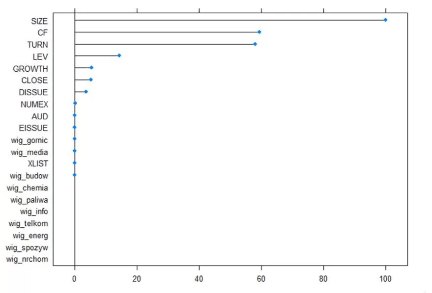 A ranking of importance for model [6], estimated using the XGboost method, indicates that the most important variable is CLOSE, which is practically consistent with the logistic regression model.