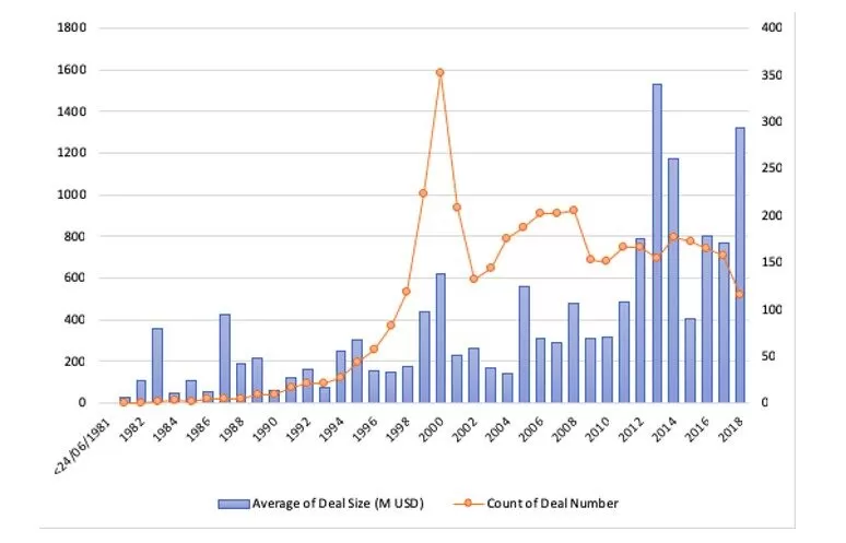 Fig. 1: The summary of the number of deals between 1981 and 2018 and the average deal size in M USD