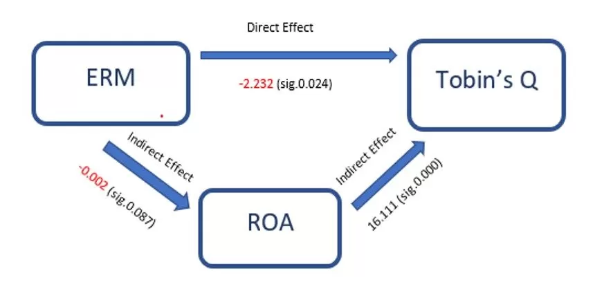 Figure 1 presents the mediating role of ROA in the relationship between ERM and Tobin’s Q. We examine this role as Idris & Mohezar (2019). Directly, the coefficient of the relationship between ERM and Tobin’s Q is -2.232 with sig 0.024. Then, the correlation coefficient between ERM and ROA is -0.002 (sig 0.087), and the coefficient of the relationship between ROA and Tobin’s Q is 16.111 (with sig 0.000). Thus, the indirect relationship between ERM and Tobin’s Q is calculated as follows: