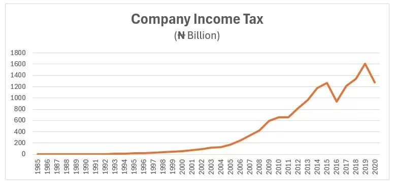 The graph of Company Income Tax above shows the growth trajectories for the 36 years under consideration. Like the Petroleum Profit Tax graph, there was a slight fall in revenue in 2020, very likely due to the unsavory impact of Covid’19.
