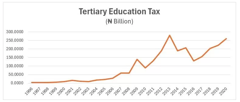 The graph of Tertiary Education Tax below, shows a consistent growth in Tertiary Education Tax over the period of 25 years, under consideration. The highest revenue from Tertiary Education Tax was realized in 2013, the sum of 279.35 Billion Naira.