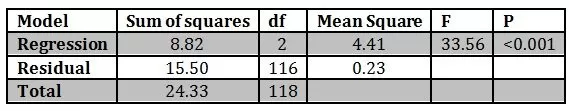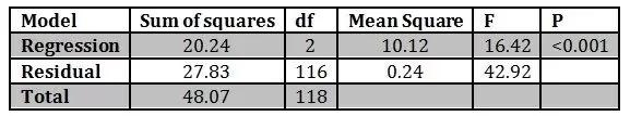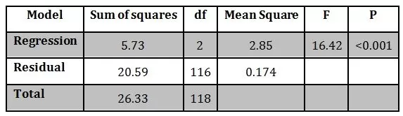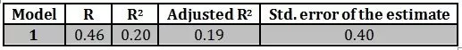 The table given below indicates that the value of R2 = 0.41. This indicates that there is 41% variance in the model and the extrinsic job satisfaction. The model is significant statistically (F = 42.92, p < 0.001).