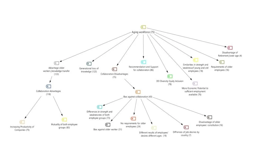 Applying MAXQDA one main code, reflecting the subject ‘’Aging workforce’’, has created to nine ‘’first-level subcodes’’, reflecting by the upper term the importance of the research field within the labour market. Two ‘’second-level subcodes’’ have contributed to the contrasting topics ‘’advantage of older workers, which led to the section ‘’collaboration advantages’’ and ‘’bias against collaboration’’ of two generations, which is enclosed by the section ‘’collaboration disadvantages.’’ Eight ‘’third-level-subcodes’’ have been emerged inductively and deductively. The present literature has been encoded by the method of structured content analysis. Thereby passages have been encoded in 1318 codings and subsequently analysed in relation to the research question. Synthesising all data, led to the following results and conclusion. Frequent individual studies and researches reflecting similar results could lead to an inductive relation with possible recommendations for companies against their bias. Overview of the created codes and subcodes, as well as their hierarchy, see Figure 2.