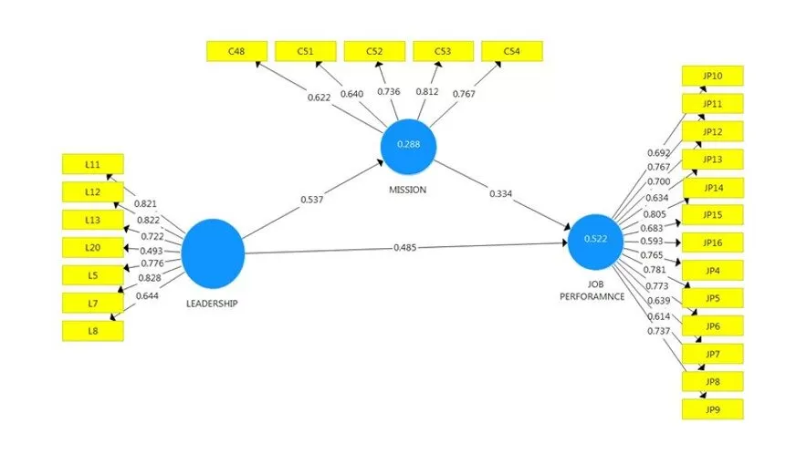 According to the above table, it can be explained that; transformational leadership style had a significant positive effect on job performance. Transformational leadership had a significant positive effect on Mission. Likewise, Mission had a significant positive effect on job performance.