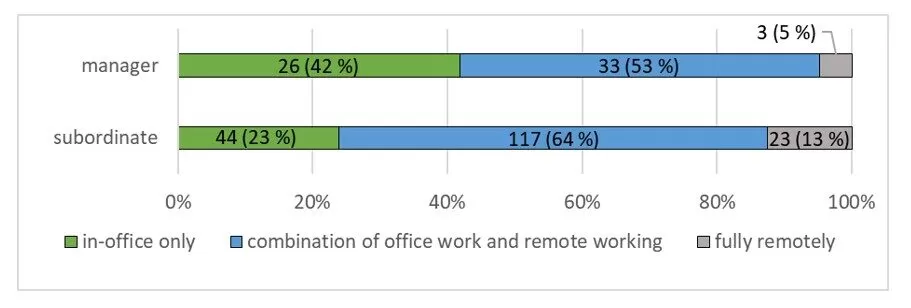 One of the other aspects that may influence the use of remote working is the position of the respondent in the organisational structure of the workplace, i.e., whether he or she is a subordinate employee or a manager who assigns and controls the work of others. Managers accounted for 25 % of the sample. The responses showed that managers used remote working or hybrid working to a lesser extent than subordinate employees, but the difference was only in the order of percentages (see Fig. 3.), suggesting that managers learned to manage and control the work of their subordinates remotely at least partially during the pandemic, or were forced to do so by circumstances.