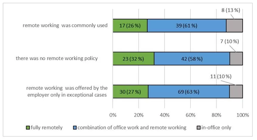 According to the questionnaire survey, remote working was the most common in workplaces that had already used remote working prior to the pandemic and the least common in workplaces that had no experience with this method of working.