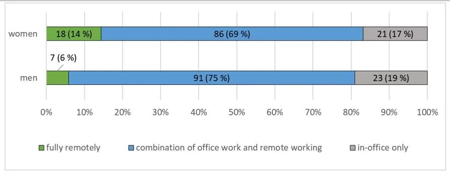 Survey data showed that more than twice as many women as men used full remote working, but the difference in the total number of women and men who used full or partial remote working was only 2 % (see Fig. 1.)