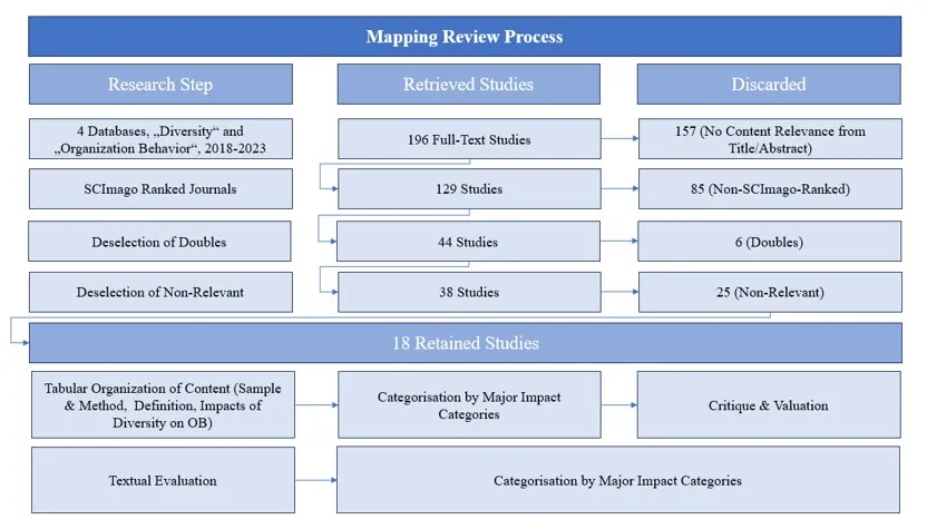 According to James (2016), the reviewer team’s initial task is to delimit the scope of the topic under review. This step involves setting research boundaries and defining the relevant topic areas of the subject under investigation (Bragge et al., 2011). The present study examines how organisational behaviour impacts different forms of diversity in a business and workplace context, and how this affects various business fields, drawing on recent research. The analysis focuses specifically on businesses and work environments, excluding other areas where diversity may be observed and deemed relevant, such as society, politics, or migration. The study does not inherently exclude specific aspects of organisational behaviour, nor does it specifically concentrate on forms of diversity, such as gender or ethnicity. Instead, as a mapping review, its objective is to provide an overview of the available research fields and the complex puzzle of observed impacts.