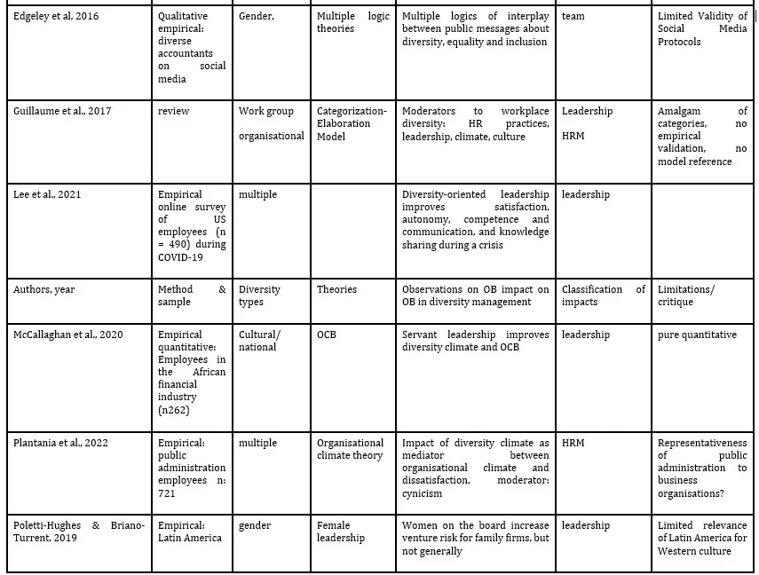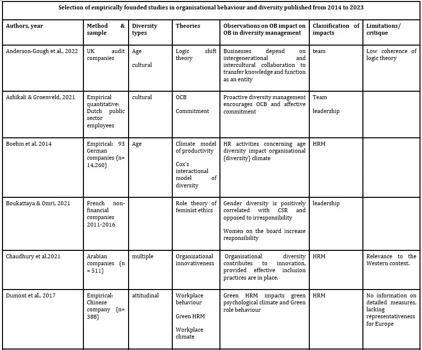 After the initial automated preselection process, the identified studies undergo a manual secondary selection to eliminate duplicate retrievals and studies that do not significantly contribute to the topic or fail to meet quality requirements. The final selection of studies retrieved in the primary research process (i.e. recent publications from 2014 to 2023 retrieved directly based on the keywork combination) is then categorised using an evaluation table, which encompasses the following aspects: authors and publication data, research methodology & sampling, availability of definitions of diversity and organisational behaviour, observations on diversity’s impact on organisational behaviour, and critical assessment of methods and insights. Subsequently, the results are classified according to the impact fields addressed, achieved through the completion of the initial tabular evaluation. A subsequent textual analysis of the results employs the identified categories, facilitating a comprehensive and meaningful discussion of the findings. By triangulating the results across sub-research fields and considering critiques and limitations identified in individual studies, this analysis evaluates the accomplishments of previous research, highlights areas for further investigation, and delineates opportunities for more in-depth exploration.