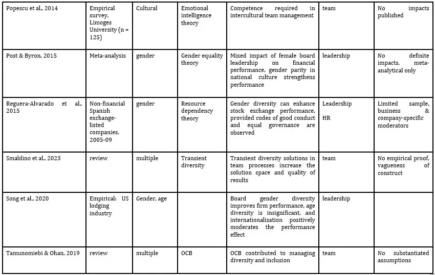 Diversity in team interaction is addressed in seven recent studies (retrieved in the primary research process: Aggarwal et al., 2019; Anderson-Gough et al., 2022; Ashikali & Groenveld, 2021; Edgeley et al., 2016; Popescu et al., 2014; Smaldino et al., 2023; Tamanomiebi & Ohnan, 2019).