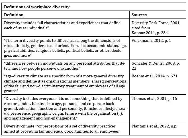 Table 2 summarises a series of definitions of diversity available in the academic literature, specifically in the context of business and the workplace.