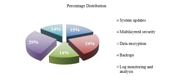 Figure 1 presents the percentage distribution of key cybersecurity measures implemented to mitigate ransomware risks. The largest share (30%) is attributed to regular data backups, highlighting their critical role in ensuring data recovery and business continuity. Multilayered security mechanisms (25%) and system updates (20%) are also recognized as essential components of an effective defense strategy, significantly reducing the probability of successful attacks. Data encryption (15%) and log monitoring with analysis (10%) contribute to strengthening both proactive and reactive aspects of organizational cybersecurity.