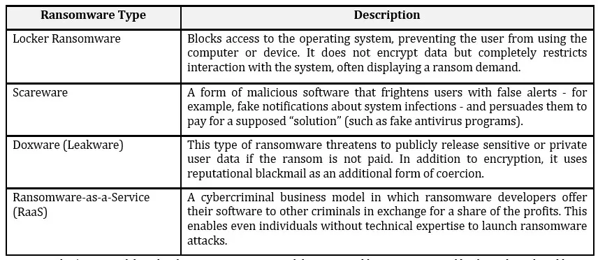 Ransomware attacks vary in terms of their execution methods and the objectives pursued by cybercriminals. In the scientific literature, several fundamental types of ransomware are distinguished, depending on their mode of operation and intended impact.