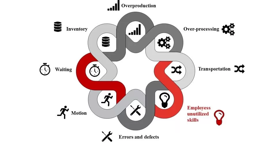 Fig. 1: 8 types of waste (sketch based on Womack and Jones (1996), graphics by PresentationGo.com)