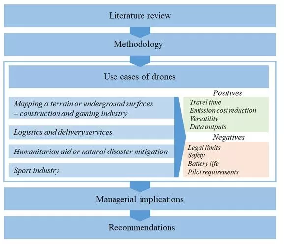 Drones potentially yield lower energy consumption and reduce greenhouse gas emissions, thus reducing the carbon footprint and enhancing environmental sustainability (Chiang et al. 2019). There are countless areas where drones are being used or have a great potential for their application, such as: cinematography, tourism, crisis management, marine or underwater purposes, etc. (Yaacoub et al. 2020). It is predicted that more than 10,000 drones will be operational for commercial use within the next five years, mainly due to their advantages over commercial helicopters when it comes to costs and budget (Yaacoub et al. 2020; Thiels et al. 2015). The drone worldwide market revenue is predicted to grow from present 26 billion U.S. dollars (2021) to 43 billion U.S. dollars until 2025 (Statista.com, 2021). The number of use cases of using drones in the commercial sector rises by the day, however, they are not always positive in nature. Often, drones are used for criminal activities, which spawns a security concern (Weaver, 2014; Statista, 2015; Yaacoub et al. 2020). Where there are malicious activities, new legislation is necessary. So not only the companies need to tackle the physical drone limitations, such as battery life and flight range (Cokyasar, 2021), they also need to study the legislation not to break any laws. For international companies, it might be a huge problem as the legislation is not entirely unified in different countries (Yaacoub et al. 2020). This article provides an overview of examples (use cases) where the drones are commercially used in a positive and in a negative way. Practical examples are analysed from the area of construction, sport, and gaming industry along with examples of fields such as logistics and delivery services, humanitarian aid and natural disaster mitigation. Therefore, the emphasis is placed on the drone use case analysis. The literature review is divided into two main parts – benefits of the drone usage, and the limitations and concerns related to the use of drones. Based on the literature review and the use case analysis, the managerial recommendations are proposed. Existing systems that have been created to address the limitations and concerns related to drones are also mentioned in the discussion part of the article, where the authors also draw conclusions. The mission of the article is to try to recommend how managers should act in relation to drones.