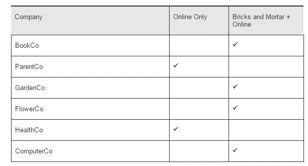 The products for sale in these stores were not large value items thereby not enabling a substantial risk on a normal size order that would require further checking. This assists when comparing stores in the nature of their business and the relative risk of fraud or deception. The names to be used are BookCo, ParentCo, GardenCo, as FlowerCo, HealthCo and ComputerCo (all pseudonyms) for the companies.