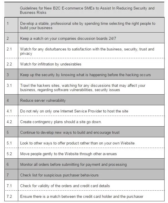 From the meetings held with each of these B2C e-commerce SMEs, it is apparent that accordance with guidelines to develop a secure and safe site is essential. However, equally important is the ongoing monitoring and maintenance of risks. It has been possible from the discussions held to derive guidelines to assist in the ongoing battle of risk reduction in B2C e-commerce. These guidelines (Table 2) establish a basis for continuance of reduced risk in a vulnerable environment. The resultant guidelines are listed in Table 2: