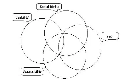 In summary, for a Website to achieve its goals (and a successful Website must have goals to give it direction and focus), it is not sufficient to have good ideas and good intentions. The Website needs to meet the following multi-faceted characteristics: a) Usability; b) Accessibility; c) Search Engine Optimized; d) Social Media/Networking Enabled. In many cases, there is overlap between these factors. This overlap can be represented graphically, as in Figure 1 (Compass Designs, 2011):