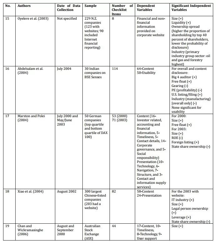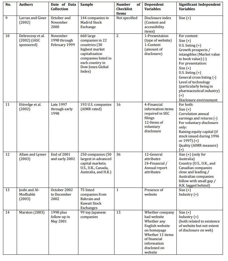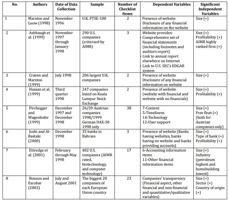 Table 1: Summary of Selected Empirical Studies Addressing Determinants of Internet Financial Reporting