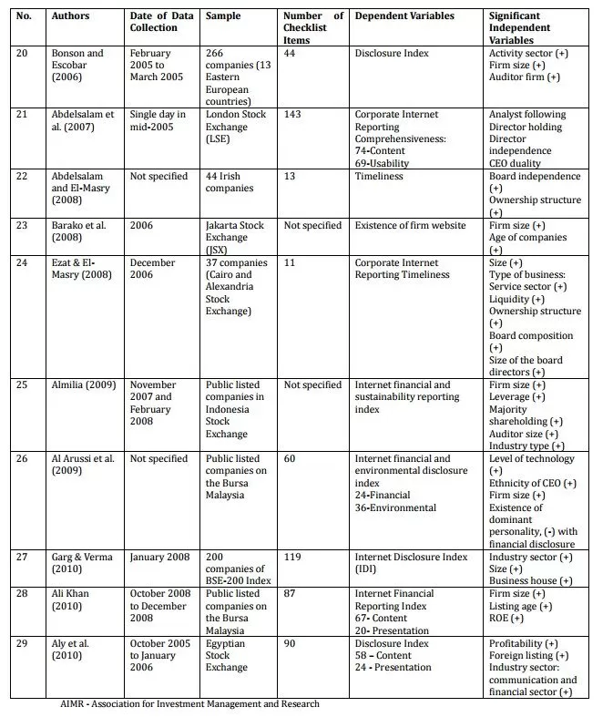 The extent of the studies on corporate internet reporting (CIR) can be categorized as either descriptive studies or association studies (Abdelsalam et al., 2007). Abdelsalam et al. (2007) explain that descriptive research focus on providing statistics on how many items of given disclosure checklist are disclosed/provided. Otherwise, association research (i.e., providing evidence of independent variables associated with the level of disclosure) emphasizes the determinants of CIR (Abdelsalam et al., 2007).