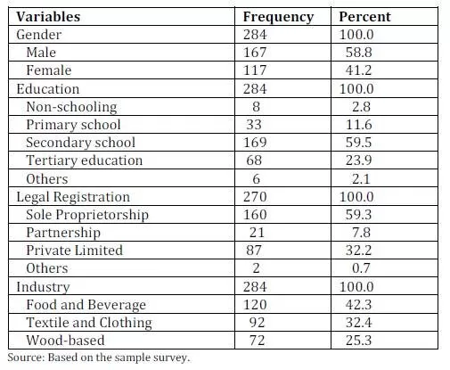 The highest level of education for most of the respondents was secondary school. However, about 24 per cent of the respondents had tertiary education, indicating that entrepreneurship turned out to be an increasing choice among Malaysians. With respect to legal registration of the business, a majority of the business was sole proprietorship and private limited. In terms of sample distribution by sub-industry, 42.3 per cent were from food and beverage, 32.4 per cent from textile and clothing and 25.3 per cent from wood-based.