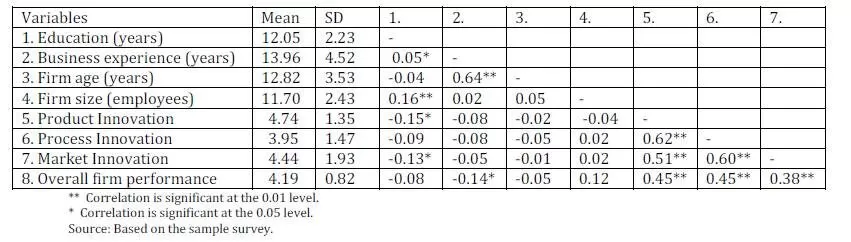 As shown in Table 2, the respondents, on average, had 12-year education (mean, 12.05), but longer business experience (mean, 13.96 years). Most of the firms were in the industry for more than ten years (mean age, 12.82), but their size was rather small (mean firm size, 11.70). More unfortunately, the emphasis of the SMEs on innovation was rather moderate. The mid-rank value of this study was 4. Judging from the mean values of product innovation (mean, 4.74), process innovation (mean 3.95) and market innovation (mean, 4.44); the SMEs gave more emphasis on product innovation and less on the other two dimensions of innovation. Probably due to moderate level of innovation, the overall performance of the SMEs (mean, 4.19) was moderate, too.