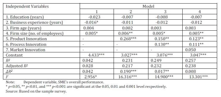 The hierarchical regression analysis was applied to estimate the impact of innovation on firm performance. As displayed in Table 3, four models were estimated in order to see how much changes would occur when one particular variable after another included in the empirical model. Separating the model estimations would help us to see the contribution of each factor more clearly through the improvement of the explanatory power of the model (the R-square).