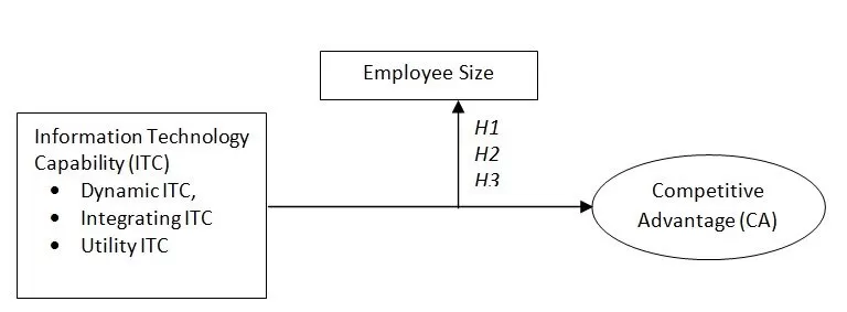 Past research indicated positive influence of IT in creating sustainable CA for domestic companies (Chang and Chuang, 2011; Jee-Hae et al., 2012; Paul, 2008), but most of the literature was done in western countries (Tallon, 2008) or other countries such as Japan (Nonaka, 1994), Taiwan (Chang and Chuang, 2011; Jian-Liang, 2012), Hong Kong (Ngai and Chan, 2005) and Iran (Yaghoubi et al., 2011). The results of the previous literature could not be generalised to Malaysian context due to cultural and business customs’ differences. Moreover, there is also limited research in testing the moderating impact of employee size in developing suitable information technology capabilities (ITC) for sustainable CA.