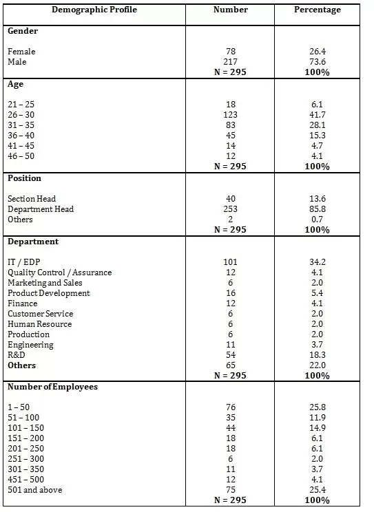 A total of 295 respondents had provided their answers to the questionnaire. The response rate is 59% (295/500). Seventy-six percent of the respondents are females and 26.4% are males, as indicated in Table 1. In terms of age, 41.7% of them are young respondents with the age of 26-30 years old. Twenty-eight percent of them fall within the age of 31-35 years old and 15.3% of them are adults with the age of 36-40 years old. Eighty-six percent of the respondents are department head and 13.6% of them are section head. Thirty-four percent of the respondents come from IT/Electronic Data Processing (EDP) department, 18.3% from R&D department and 5.4 % from product department. One quarter of the respondents work in small enterprises with 1-50 employees and another one quarter of our respondents work in large enterprises with 501 employees and above.