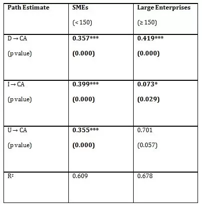 In this study, the respondents are divided into two groups based on the employee size in their organizations, namely small and medium enterprises (SMEs) (< 150 employees) and large enterprises (≥ 150 employees) (SMECORP, 2010). The path estimates displayed in Table 2 show that employee size moderates the relationships of Dynamic capability (D) → CA, Integrating capability (I) → CA and Utility capability (U) → CA relationships.