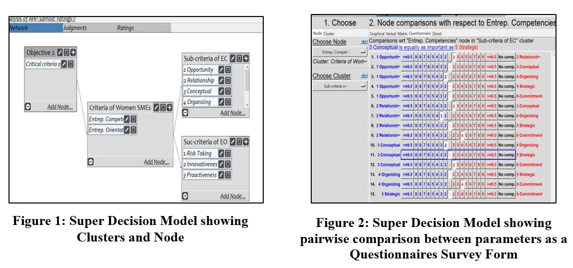 In this paper, Super Decisions of AHP is a software package developed for the analysis, synthesis, and justification of complex decisions, with dependence feedback based on the analytic hierarchy process (AHP) methodology (Sharma, Gidwani, Sharma, & Meena, 2018). The scale method of grade 1-9 was used to determine the relative merits of the elements. Figure 3.1 shows the Super Decision model, and figure 3.2 shows the comparison between the parameters through a questionnaires survey form of women-owned SMEs using the absolute scale method 1-9 based on the principle and judgement matrix of AHP.