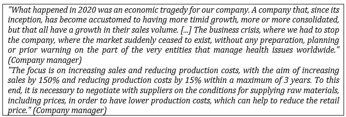 The main objectives of the financial perspective are to increase sales by 150% and reduce production costs by 15% over a three-year period. Achieving these goals requires negotiating the supply conditions for raw materials, namely price levels, in order to reduce production costs and help reduce the retail price. This strategy could also boost sales growth, in line with the efforts outlined from a customer perspective. The results obtained, although lower than intended, were what was expected given the pandemic context, and the goals set from this perspective are geared towards a sustained recovery in a more favorable context.