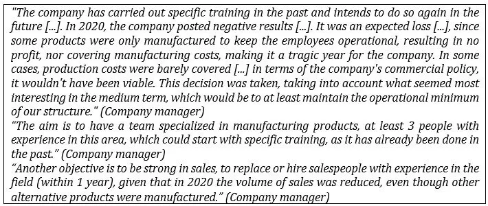 With regard to employee training, recruitment, motivation and individual team skills, it’s important to note that in the past the company implemented a specific training course for its activity. This investment in training is now intended to be repeated in the future, with a view to strengthening employees’ technical and motivational skills. The year 2020 was notable for the company’s negative results, a loss that the manager had anticipated. The production of certain products was only intended to keep the team operational, without generating any profit margin or even helping to cover manufacturing costs.
