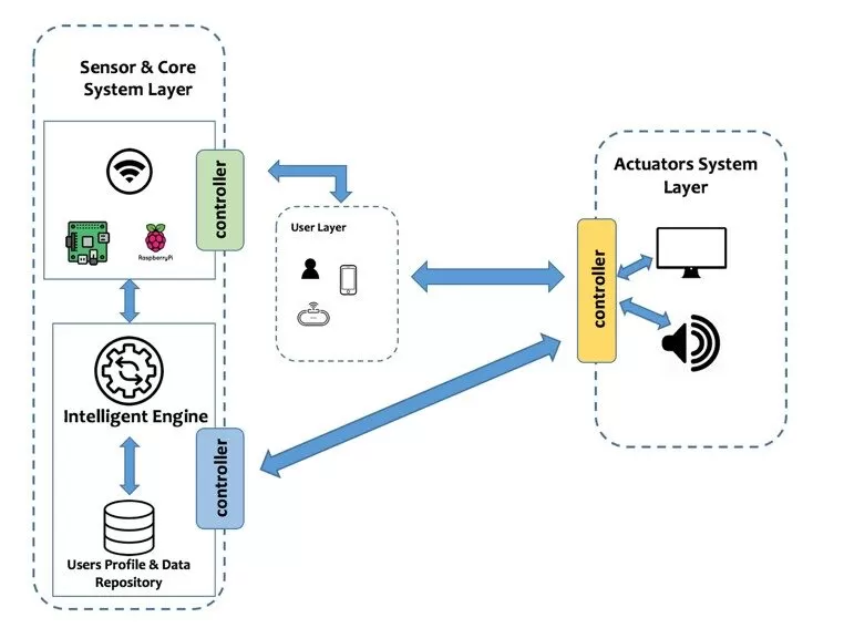 The Actuators System will output the data (e.g., using a display embedded in the physical space, using audio mechanism or sending information for the users’ smartphone). In some cases, the user can input new data and /or interact with the actuators devices (e.g., user’ smartphone, or touch screen display). This action will send new information for the Sensor and Core System controller. The system will register the information sent and all interactions that have been made by the user.