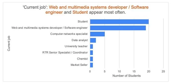 In order to get information about the manner in which students fill in professional information, we decided to conduct a survey similar in structure to a LinkedIn user profile. The job survey was filled in by 50 university students – 78% of them are currently following their bachelor studies, 18% their master’s studies and 2% are studying to get their PhD. The main goal is to analyze their education and work experience, in connection with the 6 jobs selected as proof of concept for the CareProfSys project. The one job getting the most responses (both in terms of current workplace or envisioned workplace) will be further analyzed in the Case study subsection.