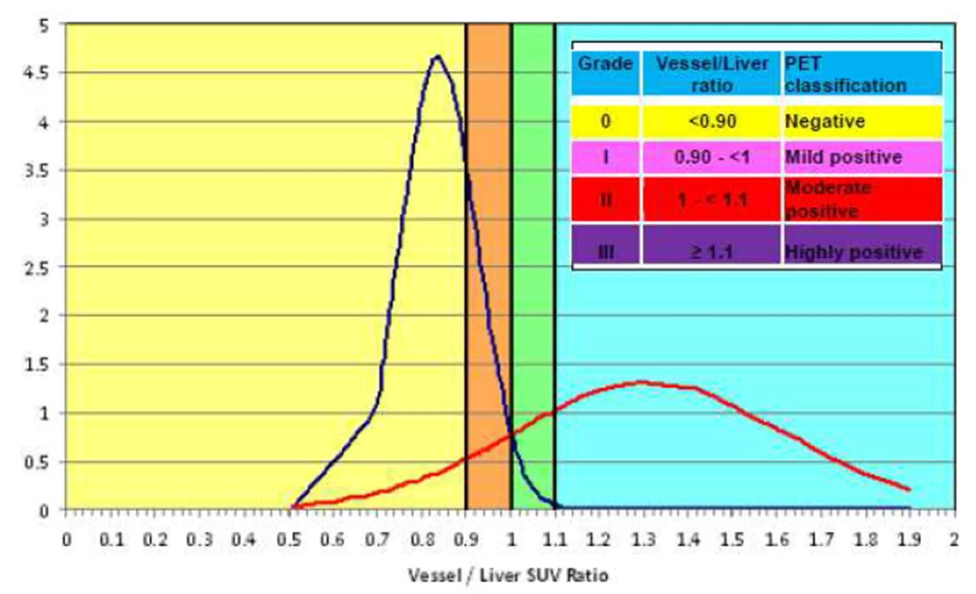 Using regions of interest SUVmax vessel to liver ratio was calculated and rated into 4 Grades. The means and standard deviations were calculated for orderly vessel/liver uptake ratio distributions, divided into two groups: negative (<1.0) and highly positive (≥ 1.0). For each group, the normal distribution was computed. Statistical analysis calculated different intervals (vessel/liver ratio < 0.9 was considered grade 0; vessel/liver ratio between 0.9 and 1 was considered grade I; vessel/liver ratio between 1 and1.1 was considered grade II; vessel/liver ratio ≥ 1.1 was considered grade III). Grade II and III were considered pathological.