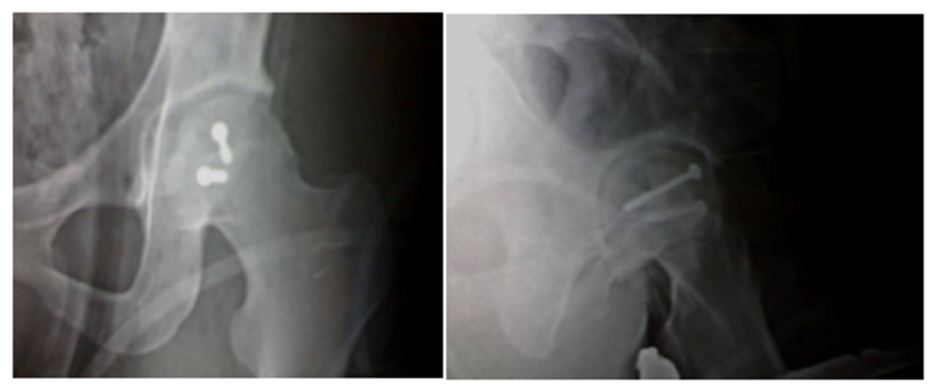 Case (1): Figure (1) X ray showed the double shadows of the fracture femoral head, Figures (2, 3) shows the CT of the fractures, Figures (4,5,6) through lateral transgluteal approach fixation with one Herbert screw and two navicular cancellous screws 4mm, Figure (7) the X ray after three years follow up no heterotropic ossification, avascular necrosis and posttraumatic arthrosis with excellent outcome.