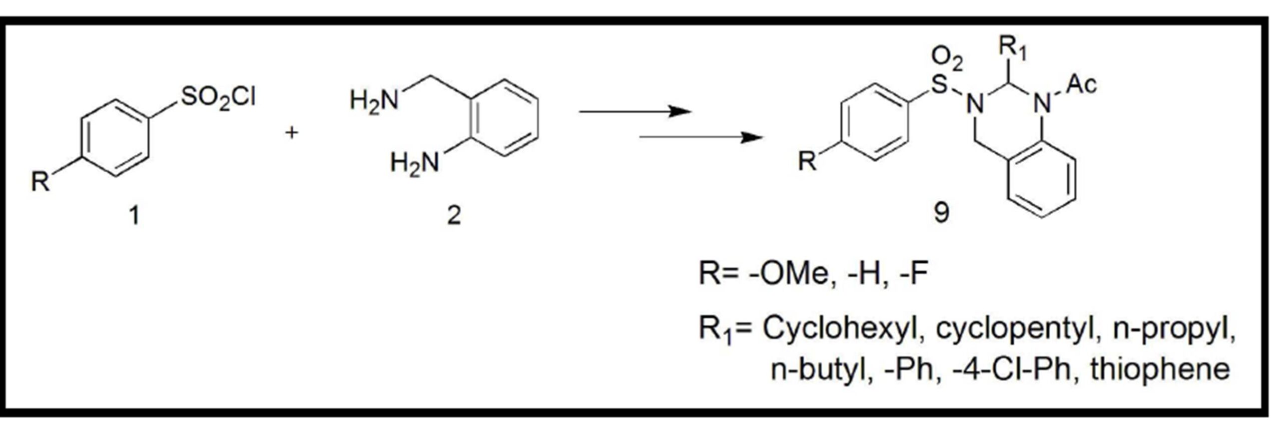 The following scheme depicts the general synthetic route for the synthesis of aryl sulfonyl group substituted tetrahydroquinazoline (Scheme: 1). To our knowledge, this is the first example of sulfonyl and acyl group substituted tetrahydroquinazoline (“N1-acyl-N2-sulfono Quinazoline”) scaffold. Owing to its importance, we have planned to synthesize a small library of these molecules using the above methodology. It is believed that this methodology will open up new easy access to this class of molecules.