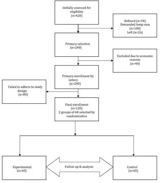 Initially based on location advantage and permission by village level authorities, three villages; Balarampur, Gopali and Salua of Kharagpur 1 Block (India), were fixed for the study. Of the populace in these villages, initially 420 adult healthy adult volunteers (35-55 years of age) of either sex were selected as per initial data screening at local level viz., economic conditions, literacy level, willingness of the volunteer, adherence to the study protocol, earlier medical records, personal and family history, availability to participate in the weekly meetings, etc. The willingness of the local panchayets (local autonomous elected constitutional body) to get actively involved was also being considered in the process. Of the 420 volunteers thus initially screened, 54 refused to give written consents. 100 volunteers demanded money for their participation and were eliminated and 26 people went to other places for various reasons and their data were omitted for consideration. Of the remaining 240 volunteers, 200 volunteers were selected on random selection basis (lottery) due to economic reasons. During the study, 80 failed to adhere to the prescribed dietary regimens and their data was not taken into account. Finally, 120 volunteers, 60 for each group (experimental and control) were selected for the study (Figure 1).