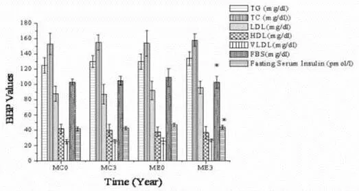 Years represented as M0 and M3. MC0 and MC3, control group; ME0 and ME3, experimental group. The BBP pattern showed significant changes in FBS and fasting serum insulin level. Parameters summarized as mean± SD (n=60) *Statistical significance (<0.05).