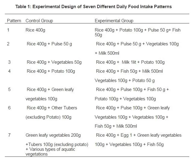 The study was conducted amongst rural Bengali population to see the effects of increase amount of protein in the diet and corresponding changes in Blood Biochemistry Parameters (BBP) after 12 hours of fasting. The volunteers selected for the study were strictly monitored for three years. They were divided into two groups- control and experimental. In the control group the volunteers consumed about 10% protein, 70% to 80% of carbohydrate and 10% fats while in the experimental group the volunteers consumed about 25% to 30% protein. Utmost care was taken to avoid significant differences in any of the other dependent variables prior to the application of the control or treatment modes. All sections of people were considered for the study and much emphasis was on the socio-economic conditions. Based on commonality and questionnaire response, seven different patterns of diet (Table 1) were framed for both the groups to achieve the maximum compliance. Each pattern was previously analyzed for proximate compositions and the data thus obtained was recorded for reference. The local agents (LAs) appointed for the study instructed the volunteers about the process of intake, pre-processing and processing, storage and consumption and followed the identical patterns. LAs were entrusted to take any needful step on necessity in consultation with the research team in case of any deviations in food intake patterns such as social gatherings, etc. Steps were taken by the research team to analyze the proximate composition of the food items as provided by Rangana, (1986); record any deviations and to formulate the daily meals. Deviations from the usual pattern occurred four times per volunteer in the experimental group and thrice in the control group. The LAs collected and labeled the different daily food items of a specific volunteer for analysis of the proximate composition by the research team.