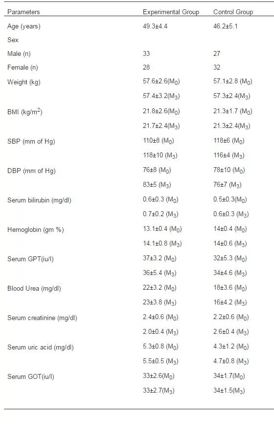 Table2: Anthropometrical, Biochemical and Clinical Data in Both Experimental and Control Groups of Human Volunteers, Parameters Were Summarized in Mean± SD, Values at the Start and End of the Experiment Were Denoted by M0 And M3 Respectively.