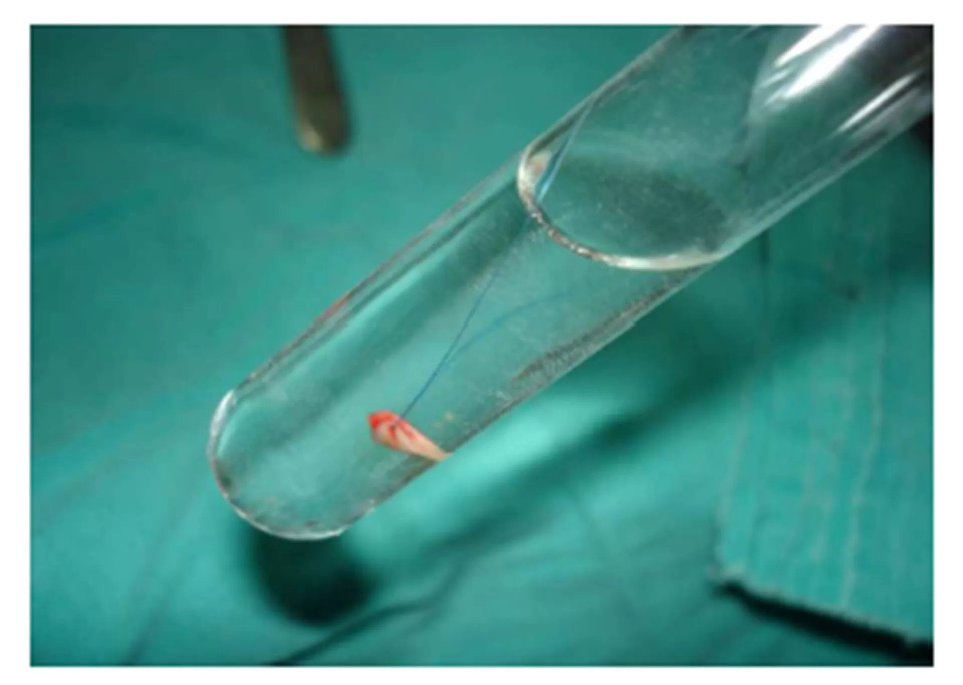 Figure 3: Appearance of the mini specimen fixed by suture material in the tube for histopathological examination.